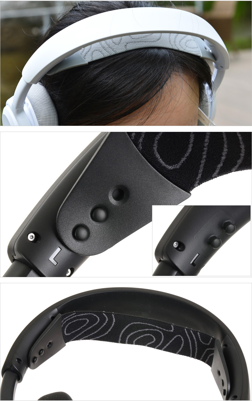헤드 부분의 모습으로 지지대와 헤어밴드가 분리된 것을 확인할 수 있다. 헤어밴드는 부드러운 재질로 머리의 통증을 최소화 하며 일반 제품들과 달리 길이 조절이 가능해 최상의 착용감을 경험할 수 있다.
