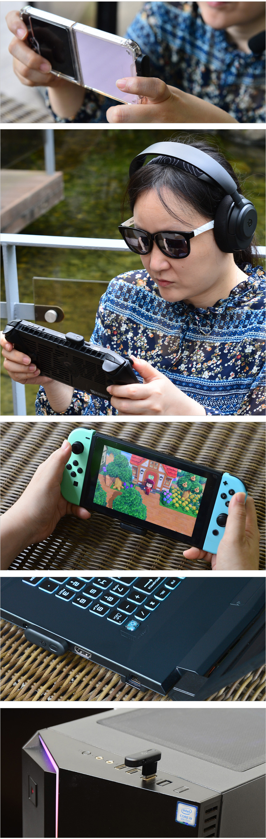 다양한 디바이스에 사용할 수 있는점은 이 제품의 큰 장점중 하나라 할 수 있다. A타입의 연결을 지원하는 일반 헤드셋과 달리 C타입 단자로 구성된 2.4GHz 무선 지원으로 C타입 단자를 지원하는 노트북이나 핸드헬스 PC, 닌텐도 스위치, 스마트폰 등과 손쉽게 연결해 사용할 수 있으며 C타입을 지원하지 않는 PC를 고려해 A타입 변환 젠더를 기본 제공한다.