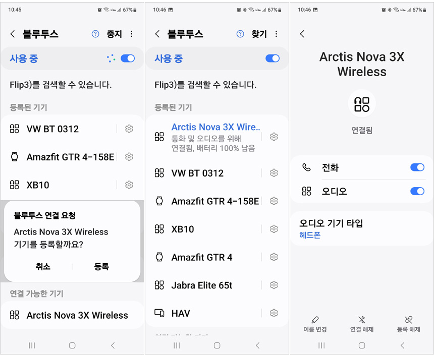 블루투스 5.3을 지원해 C타입 동글을 연결할 수 없는 디바이스나 C타입 수신기를 장착하기 힘들때 유용하게 활용할 수 있다. 상단의 사진은 스마트폰과 블루투스로 연결한 모습으로 원활하게 연결되는 것을 확인할 수 있었다. (퀵 스위치를 길게 누르면 LED가 빠르게 깜빡인다. 이때 파란색 불이 깜빡이면 그대로 기기를 검색해 연결해 주면 되고 녹색불이 깜빡이면 버튼을 한번 눌러 파란색 불이 깜빡이게 해야한다.)