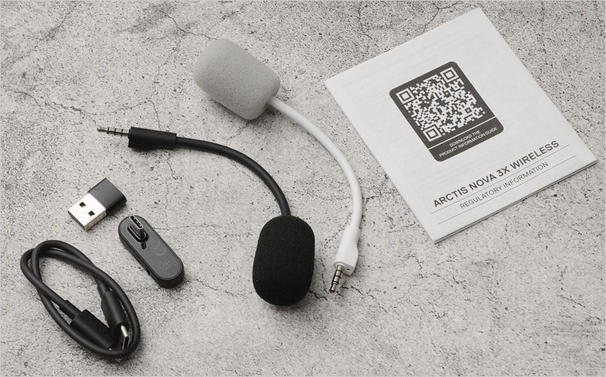 기본 제공되는 모습으로 마이크와 C타입 동글, A타입 변환젠더, 충전용 케이블이 제공된다. 동봉된 보증안내서의 QR코드를 스마트폰으로 스캔하면 설명서를 다운로드 받을 수 있다.