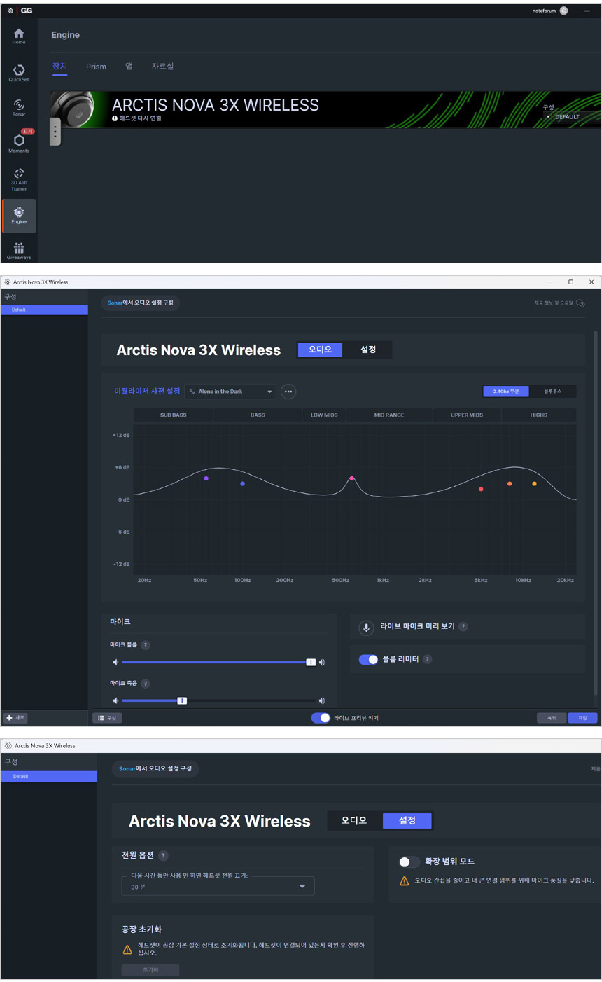 상단의 사진은 스틸시리즈 엔진을 실행한 모습으로 앱과 같이 다양한 프리셋 설정이 가능하며 마이크 볼륨과 측음 등을 조정할 수 있다. 또한 자동 전원끄기와 확장범위 모드, 초기화를 지원한다.