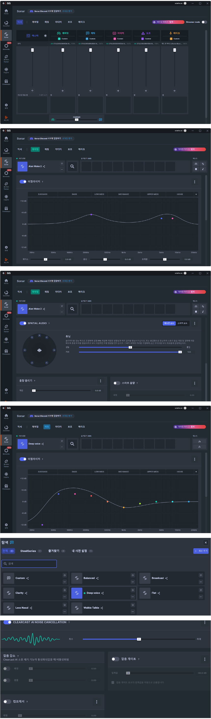 Sonar 메뉴로 이동하면 더 디테일한 사운드 설정이 가능하다. 믹서를 통해 오디오 관련 기기를 손쉽게 설정할 수 있으며 게이밍 메뉴에서는 유명 게임에 최적화된 EQ 프로파일이 제공해 최상의 사운드를 즐길 수 있다. 뿐만 아니라 마이크도 사용자 취향대로 조정할 수 있는 것을 확인할 수 있다. (노이즈캔슬링 설정이 가능하다.) @ 채팅, 미디어, 게이밍 등 메뉴별로 EQ 프리셋이 다른 것을 확인할 수 있었다.