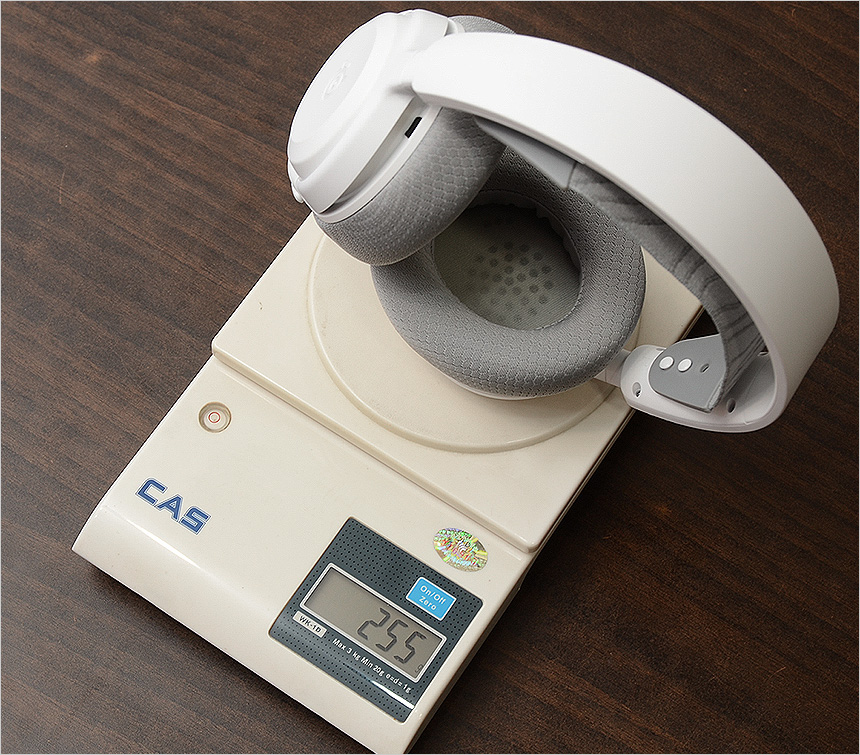 무게를 측정한 모습으로 255g으로 측정되었다. 다양한 고급기술을 지원하는 게이밍 헤드셋임에도 무게가 상당히 가벼울 뿐만 아니라 착용감도 상당히 뛰어나 장시간 편하게 게임을 즐길 수 있다.