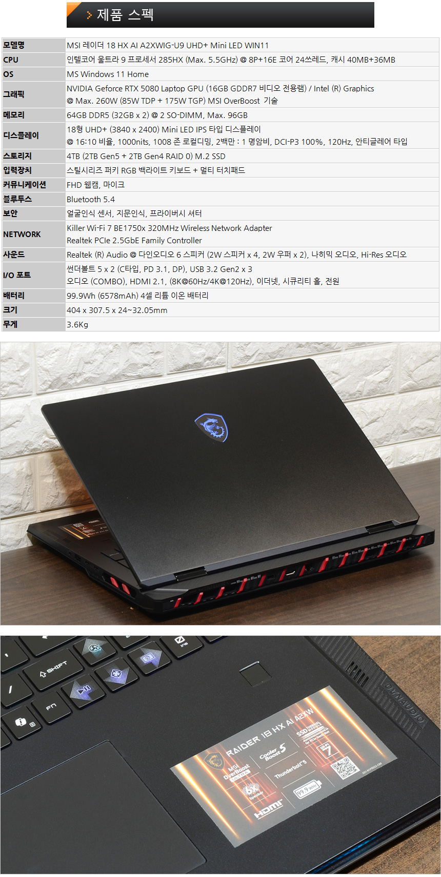 CPU 또한 하이엔드 노트북에 걸맞게 최상급 모델인 인텔코어 울트라 9 프로세서 285HX를 탑재해 4K 게이밍은 물론 전문가용 S/W 도 부드럽게 실행할 수 있으며 64GB 의 DDR5 메모리를 탑재해 부드럽게 게임을 즐길 수 있다. 뿐만 아니라 레이드 0 으로 구성된 4TB NVMe SSD를 지원해 빠른 속도를 지원하는 것은 물론 대용량 게임들을 여유롭게 설치할 수 있다.