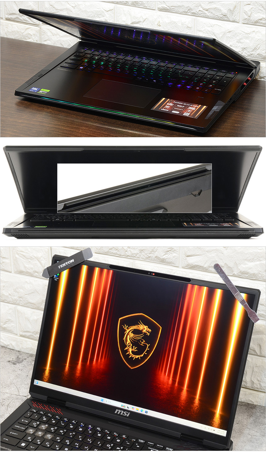 킬러 Wi-Fi 7 무선랜카드가 장착되어 있고 4TB NVMe SSD가 레이드로 구성되어 설치되어 일반 노트북을 압도하는 빠른 속도를 즐길 수 있다. 또한 2개의 메모리 슬롯을 지원하고 64GB DDR5 메모리가 장착되어 게임은 물론 전문작업용으로 편하게 사용할 수 있다. @ 바닥면 분리 난이도 하 : 눈에 보이는 모든 볼트를 풀어준 후 (히든볼트 X) 힌지 부분을 공략해 바닥면을 분리할 수 있다. 분리작업 자체는 어렵지 않지만 초고가 노트북이니 만큼 신중하게 작업해야 한다.