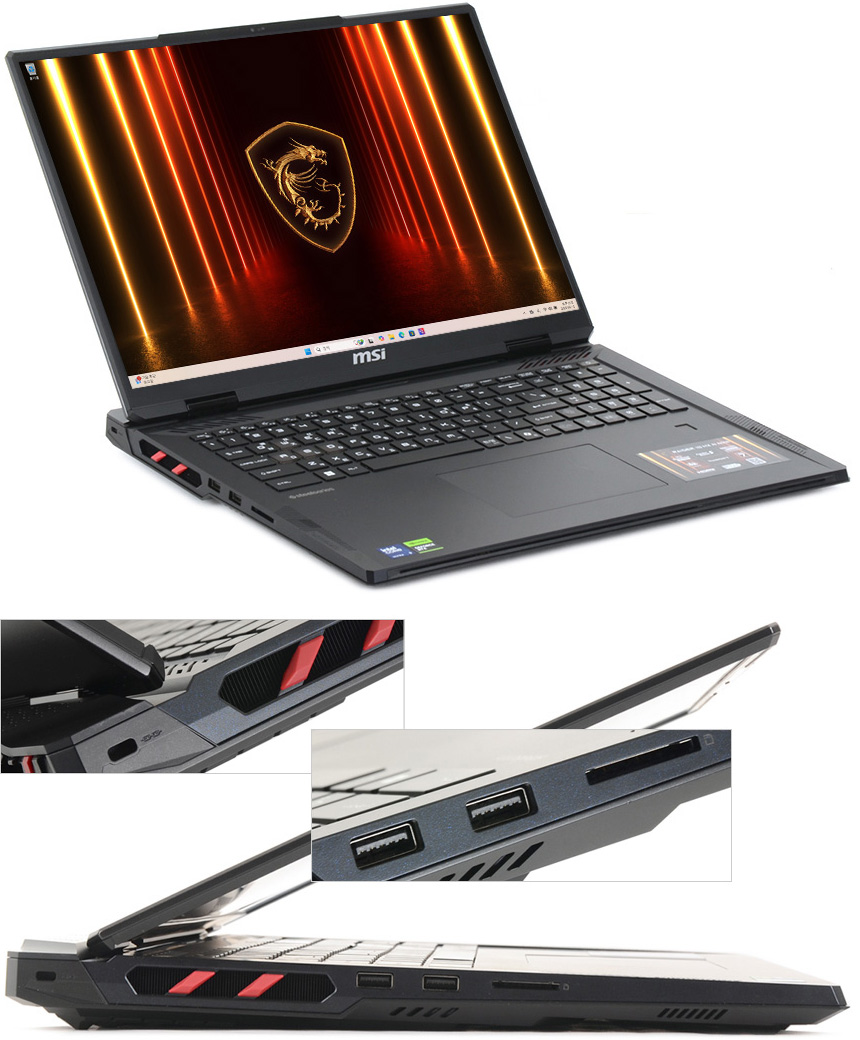 노트북 우측면의 모습으로 좌측과 같이 통풍구가 설치되어 있고 중앙에는 2개의 썬더볼트 5?단자를 지원한다. 또한 주변기기 연결을 위해 A타입의 USB 3.2 Gen2 단자가 설치되어 있고 오디오 (COMBO) 단자가 설치되어 헤드셋이나 이어폰을 연결해 사용할 수 있다. (Hi-Res 오디오 규격 DAC이 탑재되어 고해상도 오디오 음질을 경험할 수 있다.)
