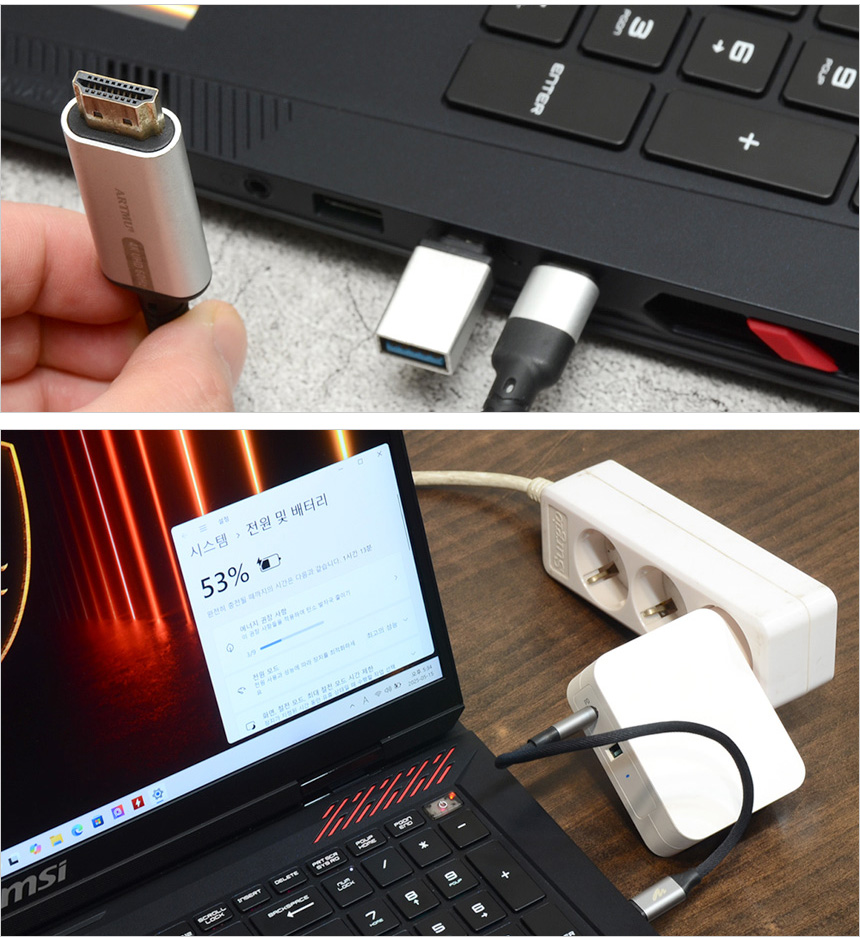 2개의 썬더볼트 5?단자는 디스플레이 출력을 지원해 모니터를 연결해 사용할 수 있으며 젠더를 장착하면 A타입의 액세서리도 연결할 수 있다. 뿐만 아니라 전원 아이콘이 그려진 단자는 PD충전을 지원해 전원 어댑터를 가지고 다니기 힘들 경우 작은 PD충전기를 이용해 전원을 공급할 수 있다. @ 65W PD 충전기도 정상 적동하는 것을 확인할 수 있었다. 단, 고성능으로 작동하는 노트북이기 때문에 단일출력 100W 이상의 PD 충전기 사용을 권장한다.