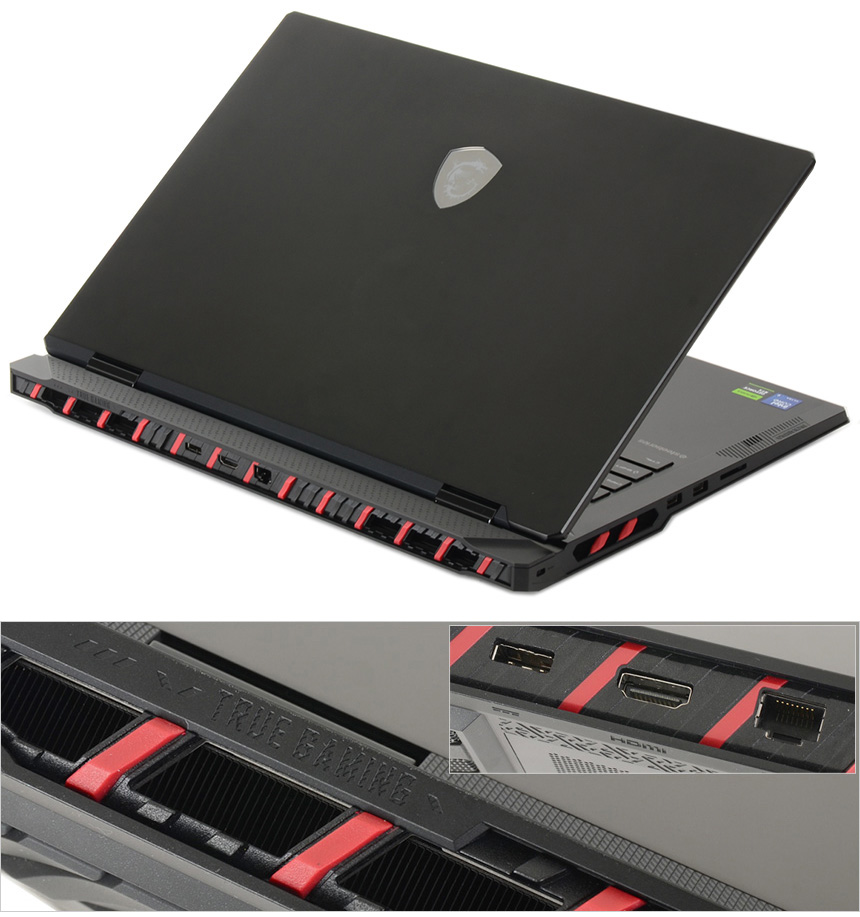 노트북 후면부의 모습으로 고해상도 모니터 연결을 위해 HDMI 2.1 단자를 제공하며 빠른 네트워크를 위해 이더넷 단자를 지원한다. 또한 전원 단자가 장착된 것을 확인할 수 있으며 양 측면에는 통풍구가 설치되어 있다.