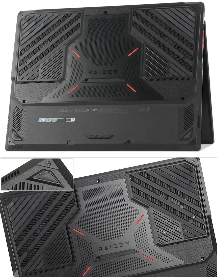 노트북 바닥면의 모습으로 공기가 내부로 원활하게 유입될 수 있도록 상단부 전체에 통풍구를 설치했으며 미끄러짐 방지 및 충격 흡수를 위해 두꺼운 고무 패드를 적용한 것도 확인할 수 있다. 또한 양 측면에는 총 6개의 스피커 (4개의 스피커와 2개의 우퍼) 일반 노트북을 압도하는 시원한 사운드를 즐길 수 있다.