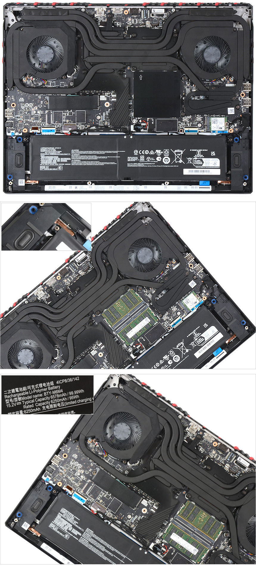 바닥면 내부의 모습으로 2개의 팬과 7개의 히트파이프를 적용해 쿨링 효과를 극대화한 쿨링부스트 5 기술이 적용된 것을 확인할 수 있다. (전작대비 히트파이프가 1개 추가되었다.) 또한 하단에는 6578mAh 용량의 리튬이온 배터리가 설치되어 있고 스피커와 무선랜 안테나가 장착된 것도 확인할 수 있다.