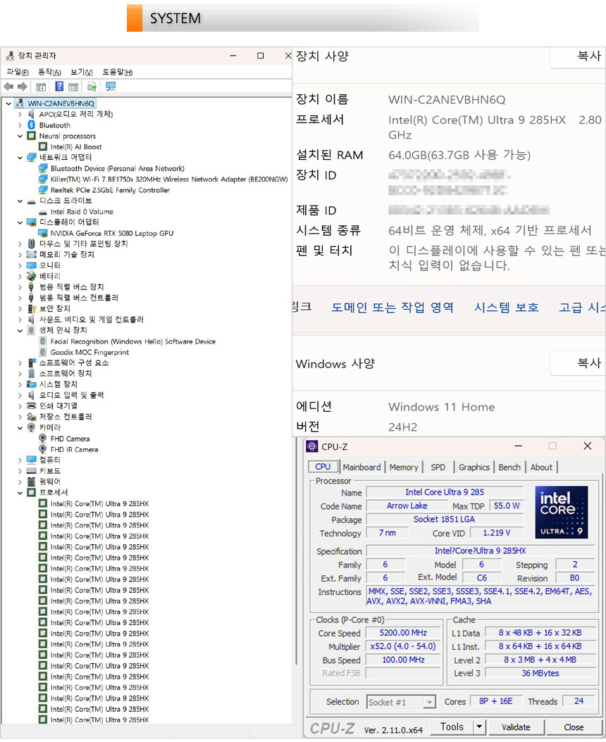 시스템 정보를 확인하고 있는 모습으로 8개의 성능코어에 16개의 효율코어가 더해진 (40MB & 36MB 캐시) 인텔코어 울트라 9 프로세서 285HX 프로세서가 장착되어 있고 64GB DDR5 듀얼채널 메모리, 4TB NVMe SSD (RAID 0) 등을 지원해 빠른 속도를 즐길 수 있다. 뿐만 아니라 RTX 5080 랩탑 GPU가 장착되어 대부분의 게임을 풀옵션으로 즐길 수 있다.