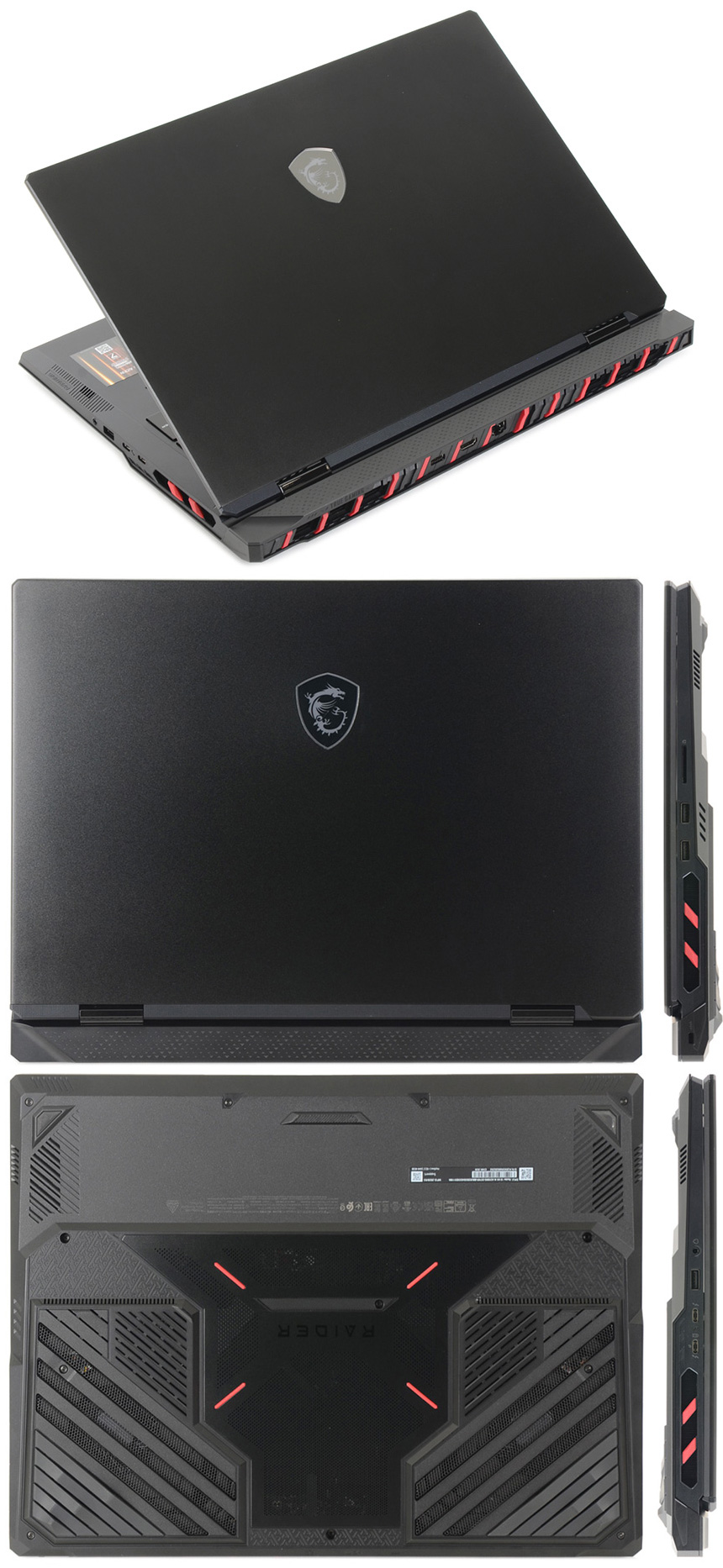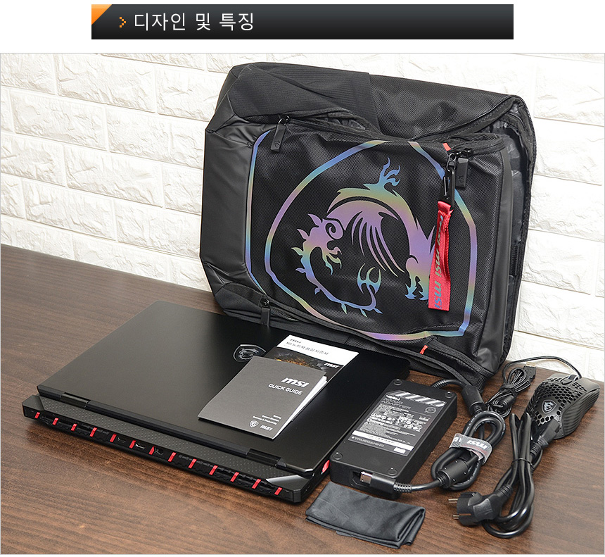 노트북의 디자인은 최상급 모델답게 중후하고 세련된 것을 확인할 수 있다. 레드 사선의 디테일과 바닥면의 데칼코마니 설계, RGB 드래곤 로고와 전면부의 매트릭스 라이트 바 지원으로 세련된 모습을 보여주었으며 블랙 컬러에 높은 마감 완성도로 보급형 제품들과 비교되는 고급스러움을 경험할 수 있었다.
