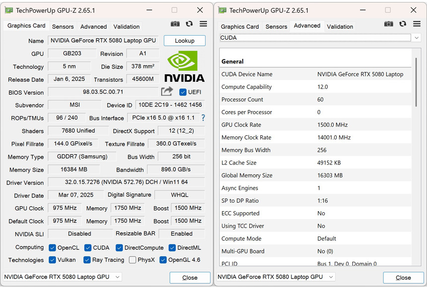 외장 그래픽 RTX 5090 랩탑 GPU의 스펙을 확인하고 있는 모습으로 1500MHz 부스트 클럭으로 작동하며 16GB 의 비디오 전용램이 제공되는 것을 확인할 수 있다.