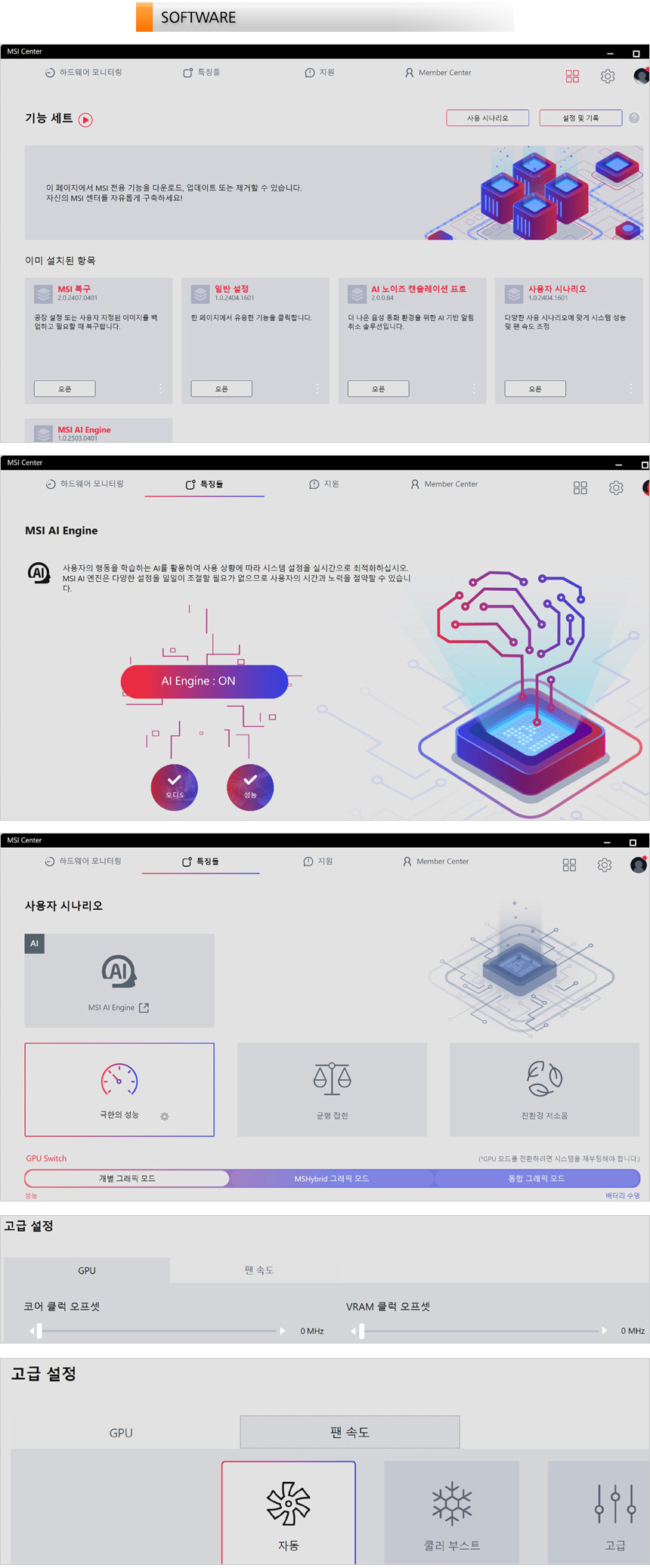 MSI 센터는 모듈형 방식을 지원해 사용자가 원하는 S/W를 선택해 설치할 수 있다. 유저 시나리오를 통해 퍼포먼스를 설정할 수 있으며 극한의 성능을 선택하면 GPU의 오버클럭이 가능하며 팬속도도 사용자가 원하는 대로 설정할 수 있다. 또한 내장그래픽의 간섭없이 외장그래픽 만으로 게임을 즐길 수 있는 GPU 스위치 기술이 제공되는 것도 눈에 띈다. (긴 배터리 사용시간을 필요로 할 경우 내장그래픽으로 작동하는 통합 그래픽 모드를 선택하기 바란다.) 또한 AI 엔진을 활성화 하면 활용도에 따라 최적의 컨디션을 유지할 수 있도록 자동 조절해 준다. @ 일반 노트북과 달리 GPU 오버클럭 기능도 지원한다.