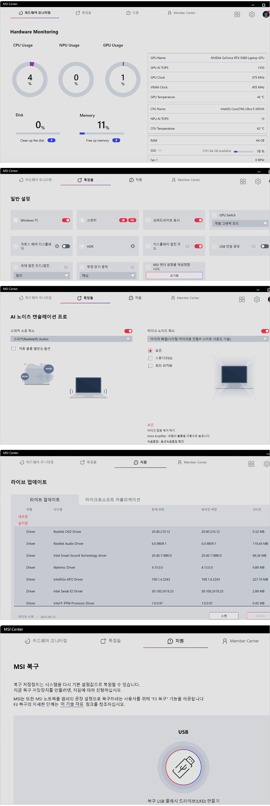 시스템 모니터링이 가능하며 일반설정에서 윈도우키와 상시전원 등을 설정할 수 있다. 또한 AI 노이즈캔슬링 지원으로 깔끔한 화상회의가 가능하며 시스템 업데이트를 지원해 최상의 컨디션을 유지할 수 있다. 뿐만 아니라 복구 기능 제공으로 소중한 데이터를 안전하게 관리할 수 있다.