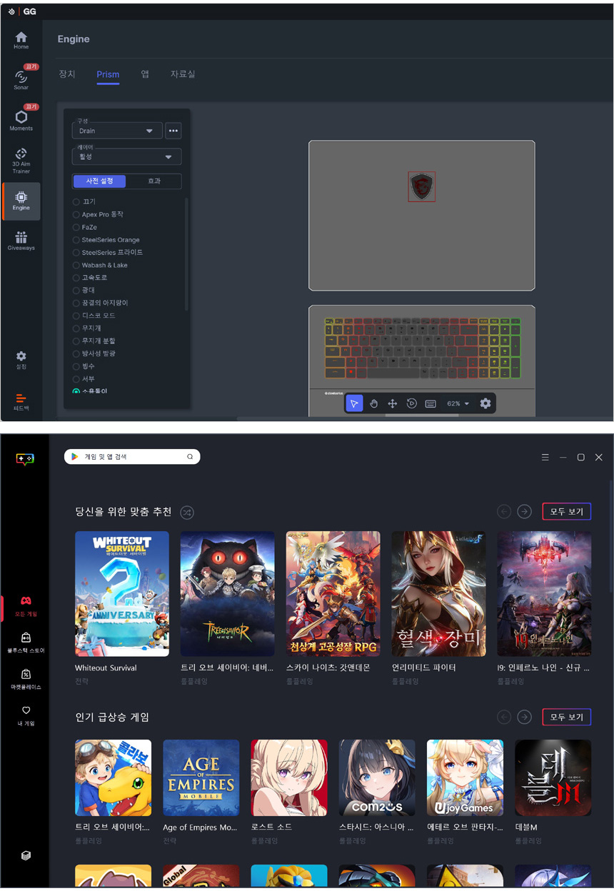 스틸시리즈 S/W를 통해 키보드 조명 효과와 심리스 RGB 터치패드 등의 컬러와 효과를 설정할 수 있다. 또한 킬러랜 설정을 위한 전용 앱을 제공하며 MSI App 플레이어 지원으로 안드로이드 스마트폰에서 사용하던 앱이나 게임을 노트북에서 즐길 수 있다.