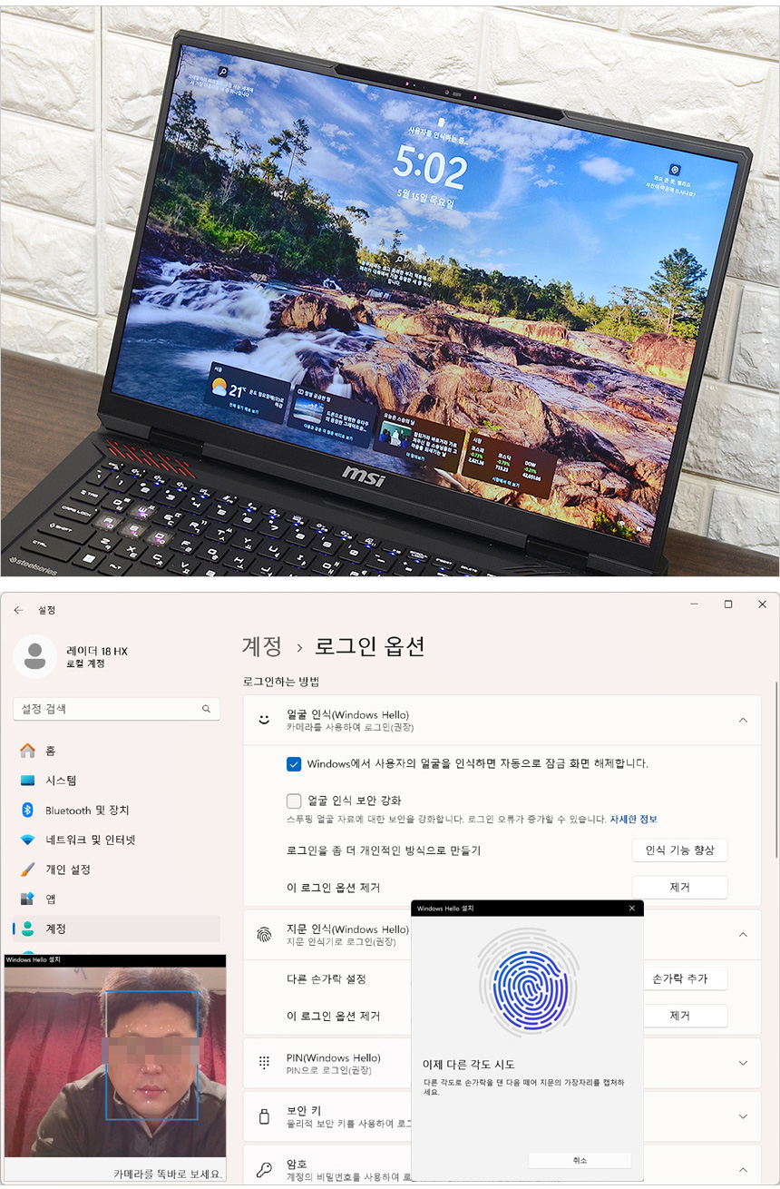 지문인식 센서와 IR 카메라가 장착된 노트북으로 보안성을 한층 높일 수 있다. 설정에 있는 로그인 옵션에서 암호와 핀을 지정하고 지문과 얼굴을 등록해 주면 추후 손쉽게 노트북을 로그인 할 수 있다. (동영상을 참조하기 바란다.)