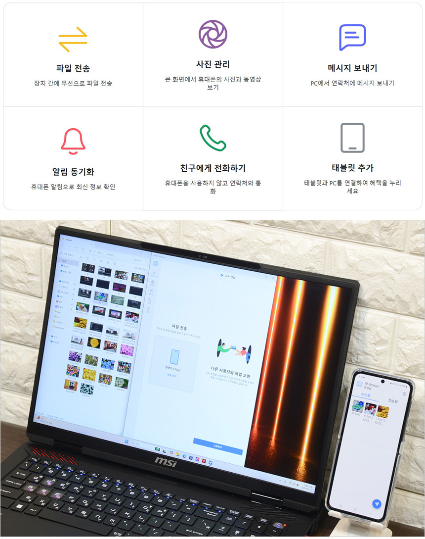 인텔 유니슨 앱을 실행하면 노트북에서 전화를 걸거나 문자 등을 전송할 수 있다. 또한 파일전송 기능을 제공해 사진과 같이 상호간 파일전송이 가능하다. (업무용으로 스마트폰을 사용하고 있다면 유용하게 기능을 활용할 수 있을 것이다.)