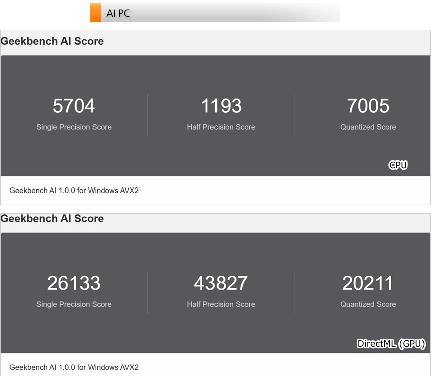 AI 전용 벤치마크 툴을 이용해 AI 성능 테스트를 진행하고 있는 모습으로 최상급의 CPU와 고성능 GPU가 탑재된 모델답게 일반 노트북과 확연하게 비교되는 높은 스코어를 보여주었다. (AI를 통한 개발이나 생성형 AI 용도로 유용하게 사용할 수 있는 노트북이다.)