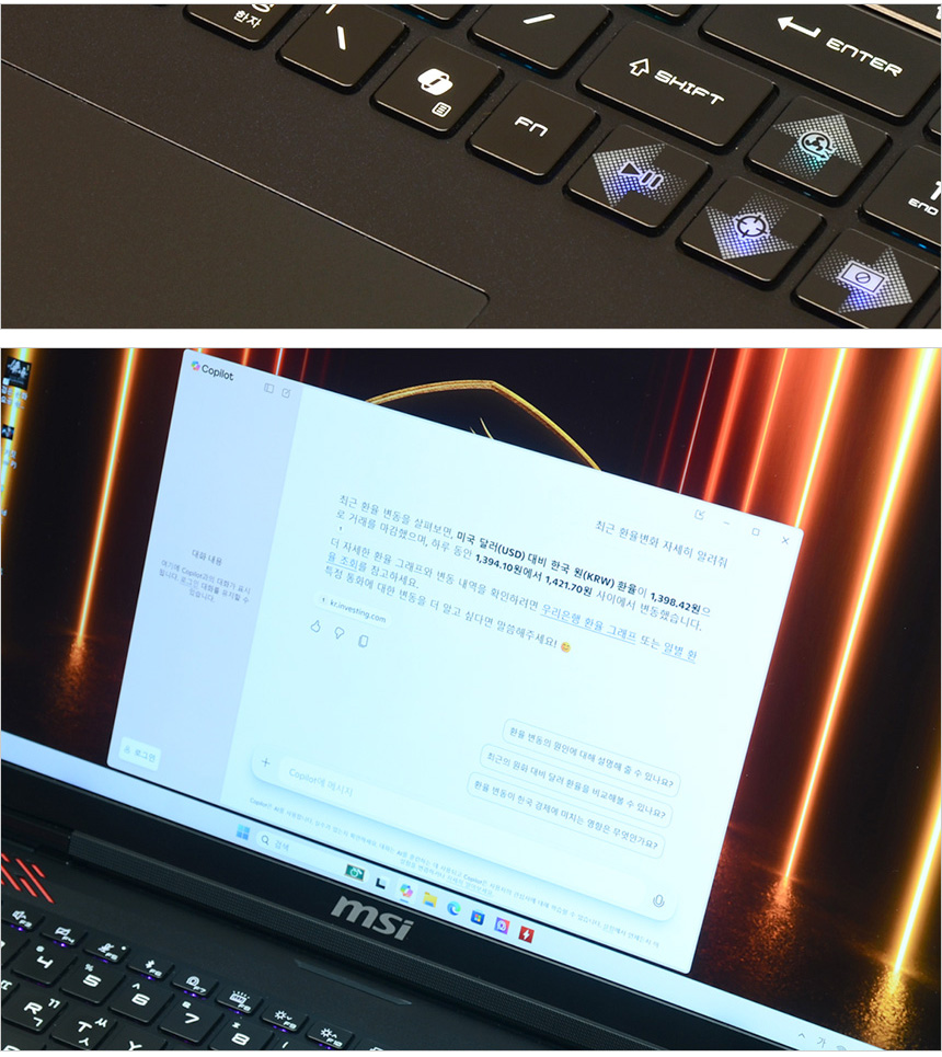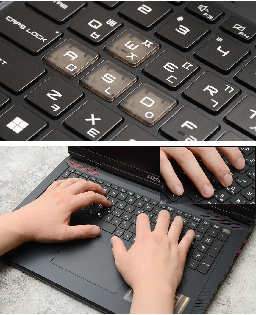 타이핑 테스트를 진행하고 있는 모습으로 18형 노트북 답게 팜래스트가 손목까지 받쳐주어 장시간 게임이나 타이핑 시 손이나 손목에 피로감이 크지 않았으며 넓은 키간격을 지원해 오타없는 고속 타이핑이 가능했다. 또한 깊은 눌림과 확연한 피드백으로 명확한 구분감을 경험할 수 있었다. (게임에서 자주 사용하는 WASD와 방향키에 포인트를 주어 주목성을 높인점도 마음에 든다.)