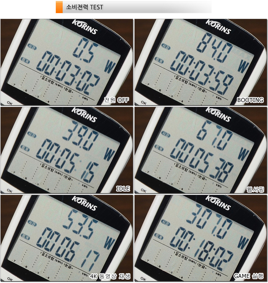 소비전력 테스트를 진행하고 있는 모습으로 (최고성능 모드, 개별 그래픽) 캐주얼한 작업에서는 저전력으로 작동하지만 하이엔드급의 게이밍 노트북 답게 게임이나 작업시 소비전력이 상당히 높은 것을 확인할 수 있다. 게임을 실행할 경우 전력제한이 해제된 CPU와 GPU가 최대 속도로 작동하고 팬도 고속으로 회전해 전력 소모가 확연하게 늘어난다. (게임 실행시 250W~280W로 작동했으며 특정 상황에서는 330W 까지 소비전력이 높아졌다.)