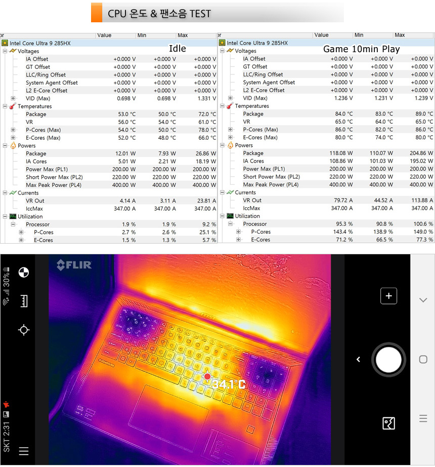 CPU 온도를 측정한 모습으로 (실내온도 17도) 아무것도 하지 않은 IDLE 상태에서는 50도 초반으로 작동했으며 10분 동안 게임을 실행한 후 온도를 측정했을 때에는 80도 중반까지 온도가 올라가는 것을 확인할 수 있었다. (일반 노트북과 달리 아이들이나 캐주얼한 작업시 온도가 높은 편이다. 그에반해 팬소음은 발생하지 않아 쾌적하게 웹서핑 등을 할 수 있다.)