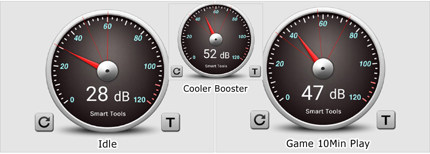 팬소음 테스트를 진행하고 있는 모습으로 아이들이나 캐주얼한 작업에서는 팬소음이 거의 느껴지지 않았다. 게임을 실행하면 2개의 팬이 빠르게 동작해 팬소음이 커지게 되고 팬이 최대속도로 동작하는 쿨러부스트를 실행하면 52dB 까지 소리거 커지는 것을 확인할 수 있었다. (팬소음이 커지는 만큼 빠르게 칩셋의 열을 식혀준다.)
