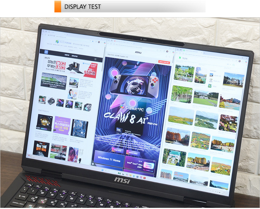 4K 동영상을 이용해 멀티미디어 테스트를 진행하고 있는 모습으로 18형 대화면에 4K 해상도의 Mini LED 패널이 적용되어 일반 노트북을 압도하는 컬러감과 디테일을 경험할 수 있었다. 여기에?차별화된 사운드 까지 더해져 만족스럽게 영상을 감상할 수 있었다. (화면 크기가 작은 일반 노트북과는 완전히 다른 수준이다. 작은 영화관에 온 기분까지 느껴졌다.)