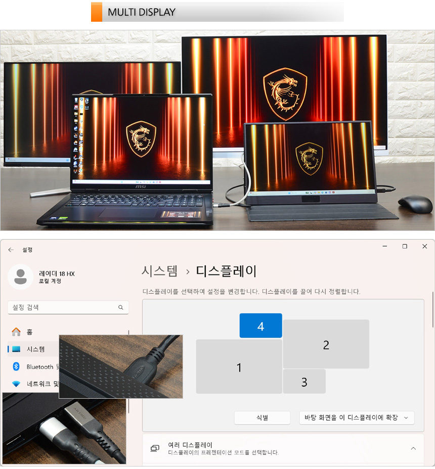 HDMI 뿐만 아니라 2개의 썬더볼트 5?단자가 영상 출력을 지원해 총 4개의 디스플레이를 사용할 수 있다. 특히 HDMI 2.1을 지원해 8K@60Hz & 4K@120Hz 모니터 연결이 가능하다. 게임은 물론 다중창 사용이 필수적인 업무용으로도 유용하게 활용할 수 있을 것이다.