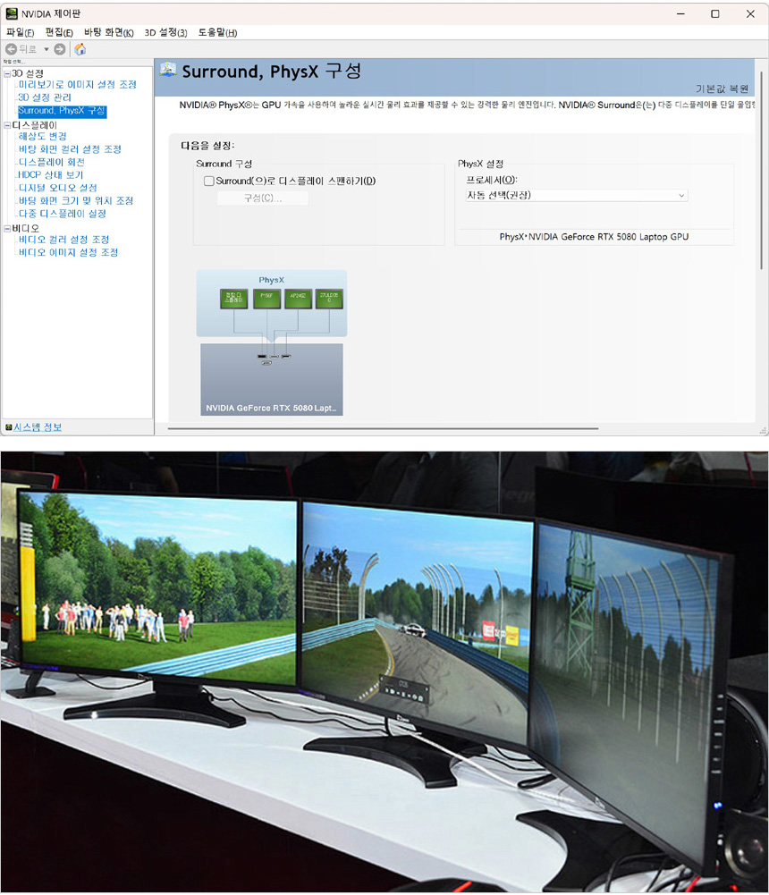 3개의 모니터를 연결해 한 화면으로 즐길 수 있는 서라운드 설정이 가능하다. 축구등의 스포츠 게임이나 레이싱 게임을 즐긴다면 대화면으로 높은 몰입감을 경험할 수 있을 것이다. (서라운드 기술을 사용할 경우 동일 모니터로 셋팅하기 바란다.)