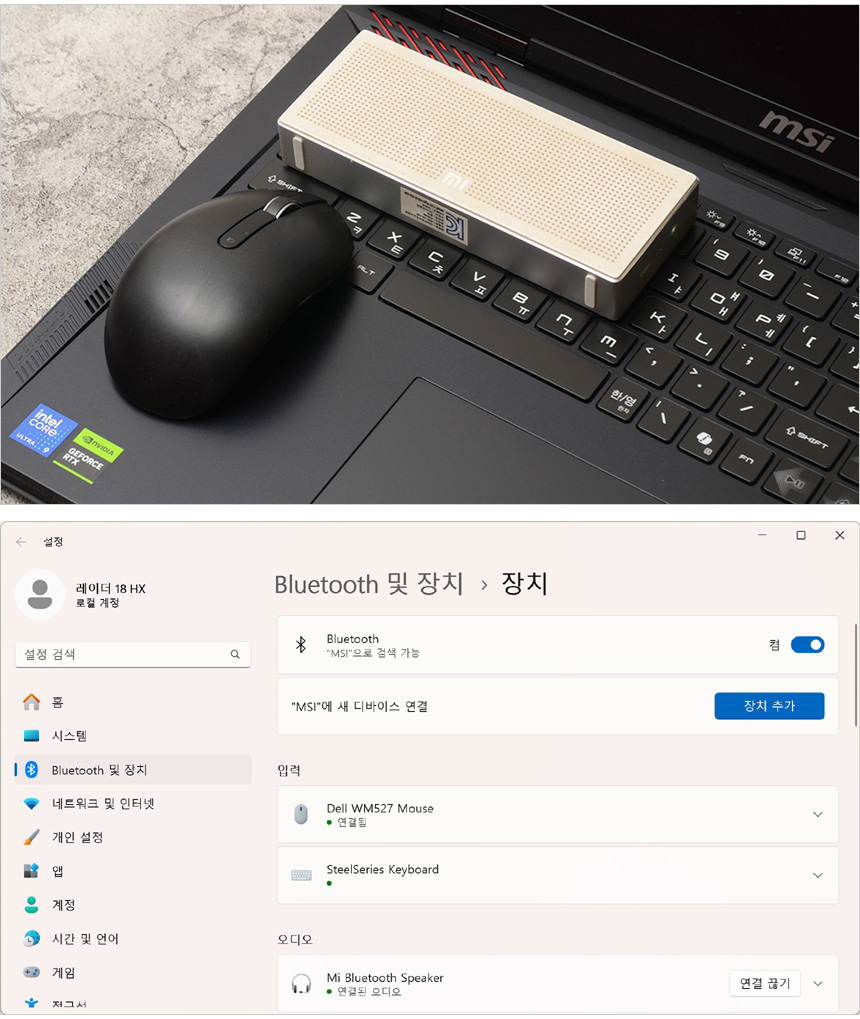 블루투스를 지원해 다양한 액세서리를 무선으로 연결할 수 있다. 상단의 사진은 스피커와 마우스의 연결 모습으로 원활하게 페어링 되는 것을 확인할 수 있었다.