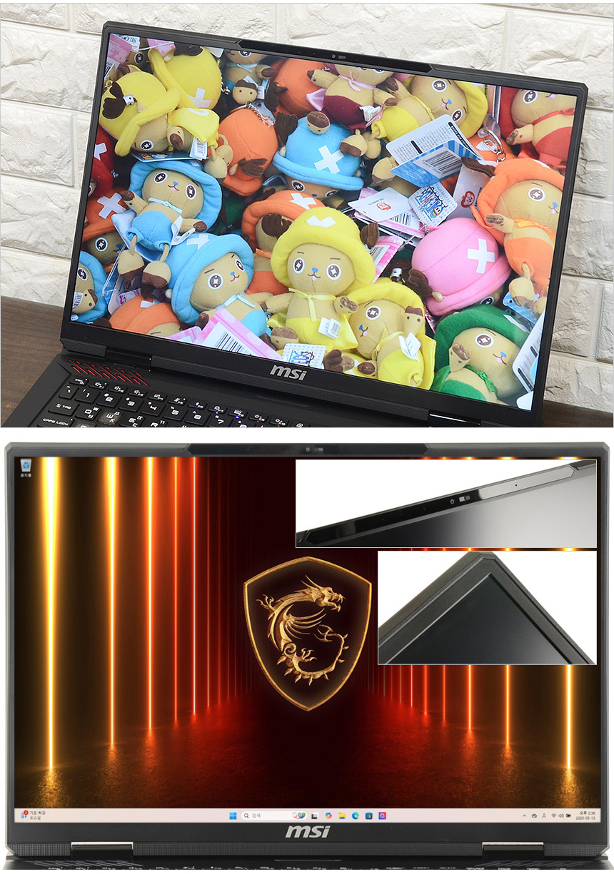 안티 글레어 타입 적용으로 자연광이 비추는 야외에서도 높은 시인성을 경험할 수 있으며 슬림 베젤 적용으로 일반 노트북을 압도하는 시원한 영상을 즐길 수 있다. 뿐만 아니라 테두리 부분에 디스플레이 범퍼가 설치되어 충격 등으로 인한 패널 손상을 미연에 방지하며 상단에는 FHD 웹캠과 마이크가 부착되어 게임 방송 및 셀프촬영 등의 용도로 활용할 수 있다.