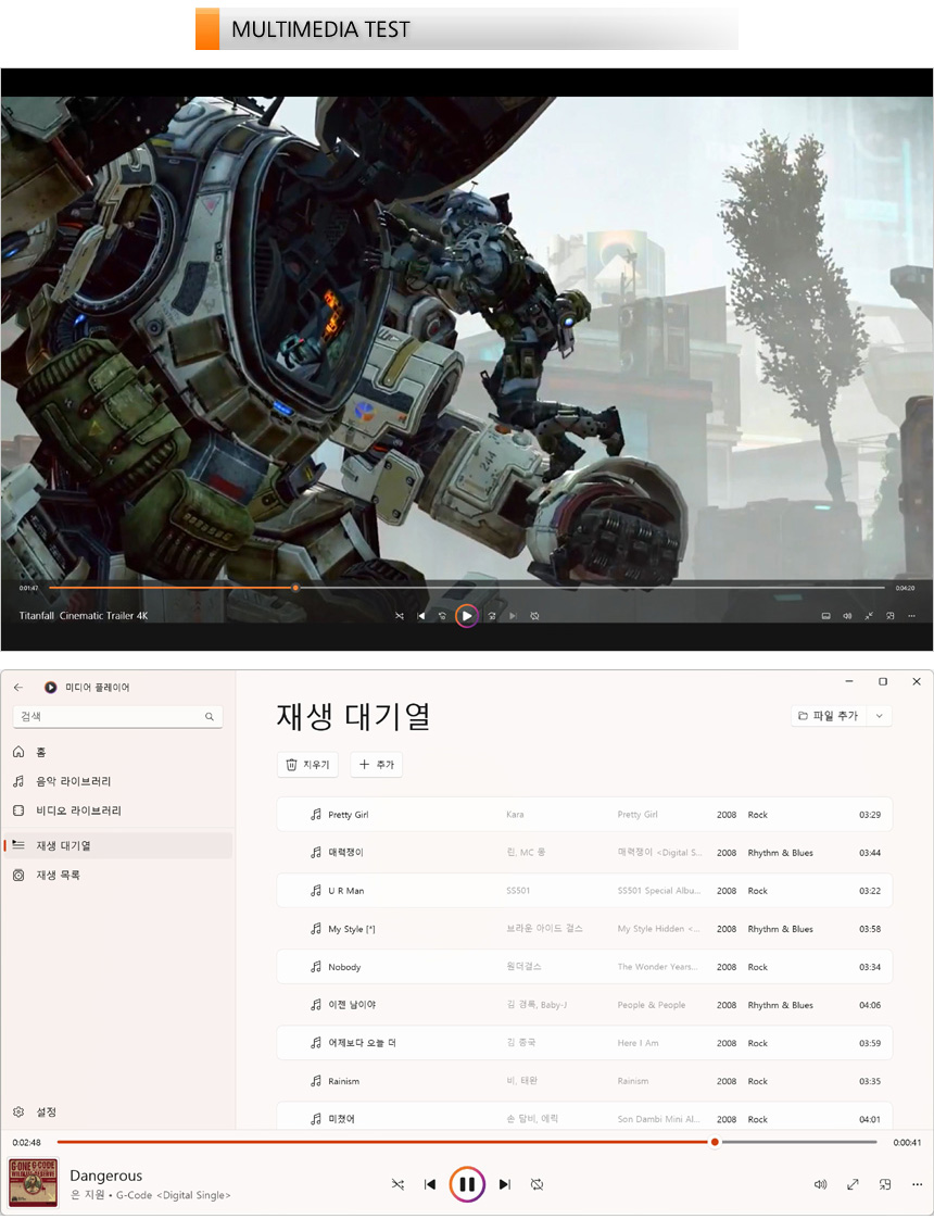또한 MP3 파일을 이용해 사운드 테스트를 진행하고 있는 모습으로 다인오디오 6 스피커와 나히믹 기술이 적용된 모델답게 박진감 넘치는 사운드를 들려 주었다. 특히 풍부한 베이스와 다이나믹한 스트레오 사운드를 제공하는 패시브 라디에이터 기술을 사용해 출력은 높지만 입체감 자체를 느끼기 힘든 대부분의 노트북과 달리 콘서트홀에 있느듯한 입체감과 공간감을 느낄 수 있었다.