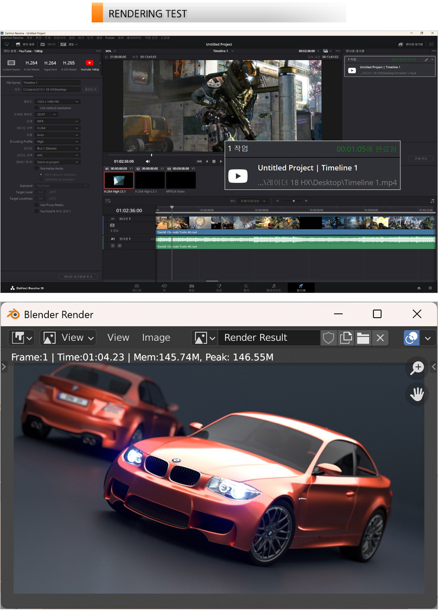 영상편집 S/W 다빈치 리졸브를 이용해 랜더링 테스트를 진행하고 있는 모습으로 (640MB, 920MB, 990MB 4K 동영상을 단일 동영상으로 랜더링, FHD 해상도에 H.264 비디오 코덱) 1분 05초가 소요되는 것을 확인할 수 있었다. 또한 블랜더 랜더링 테스트 에서는 1분 04초가 소요되었다. 일반 노트북은 물론 최고급형 게이밍 이나 크리에이터 노트북을 압도하는 수준으로 컨텐츠 제작이나 전문작업용으로 유용하게 사용할 수 있을 것이다. (최상급의 프로세서를 탑재한 노트북 답게 테스트한 노트북중 랜더링 시간이 가장 빨랐다.)