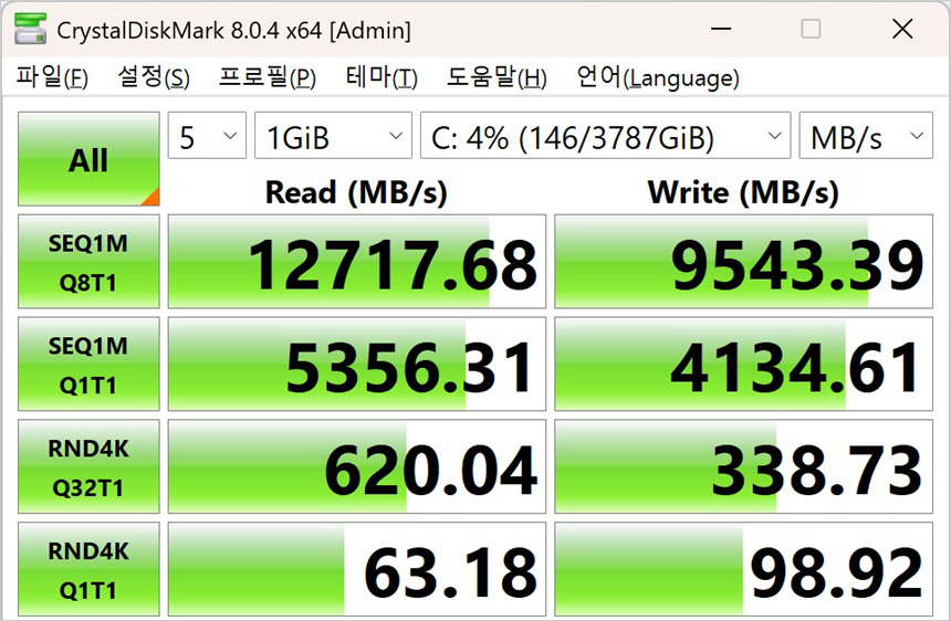 썬더볼트 5?단자를 지원해 초고속 데이터 전송이 가능하다. 상단의 사진은 USB 3.2 Gen2x2 지원 외장 SSD를 이용해 속도를 확인한 모습으로 USB 3.2 Gen2와 속도차가 큰 것을 확인할 수 있었다.