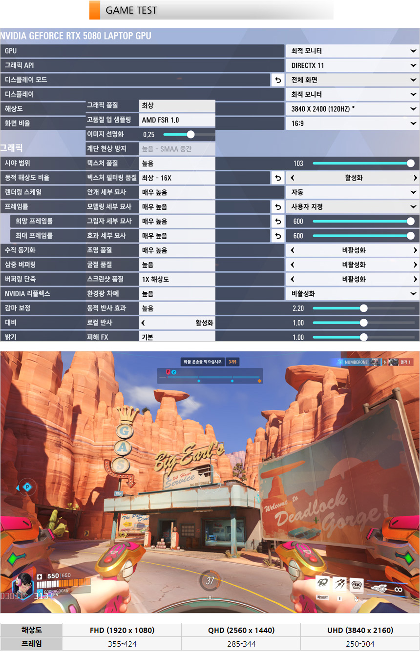 오버워치2 프레임 테스트를 진행하고 있는 모습으로 최상 옵션으로 플레이 했을 때 해상도에 상관없이 풀옵션 플레이가 가능한 것을 확인할 수 있었다. 120Hz 주사율을 100% 활용할 수 있을 것이다.