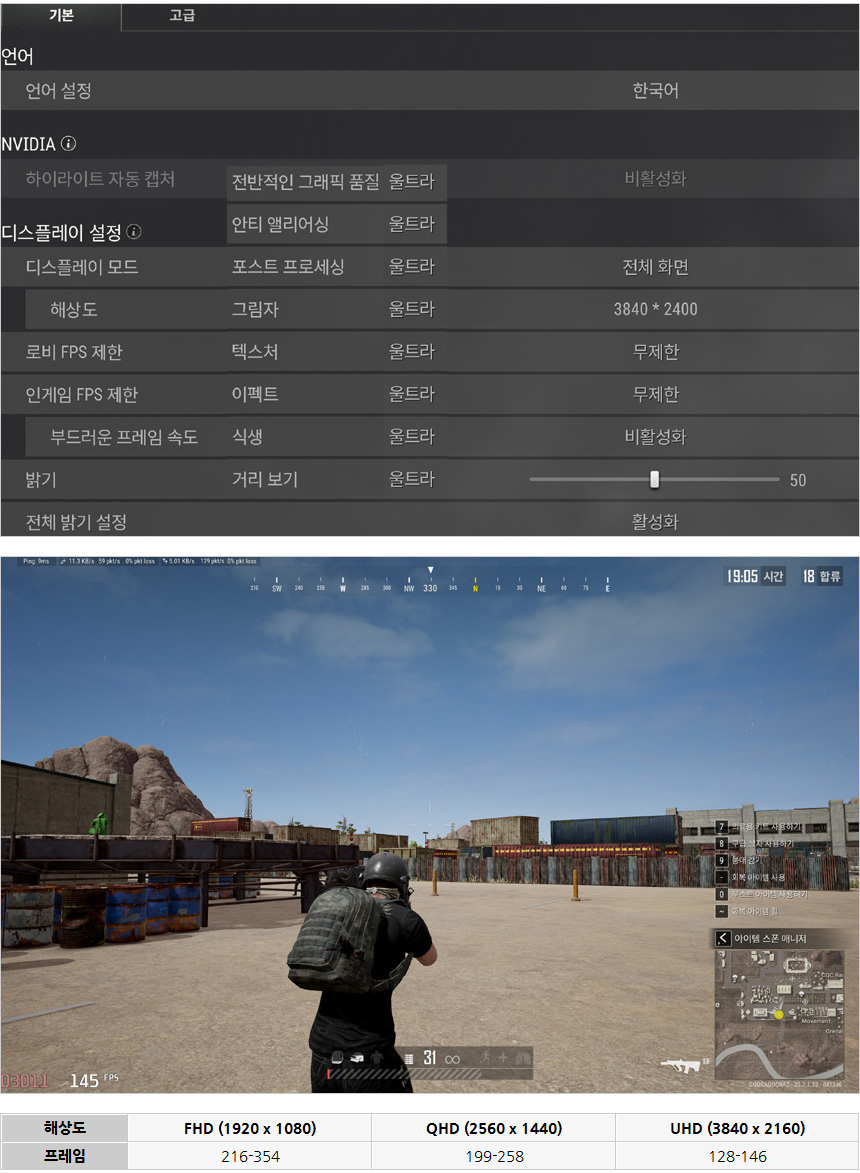 배틀그라운드를 울트라 옵션으로 플레이 하고 있는 모습으로 (연습 모드) 4K에서도 120프레임 이상으로 플레이가 가능했다. 옵션을 조정해 주면 실제 멀티게임에서도 주사율을 100% 활용할 수 있을 것이다.