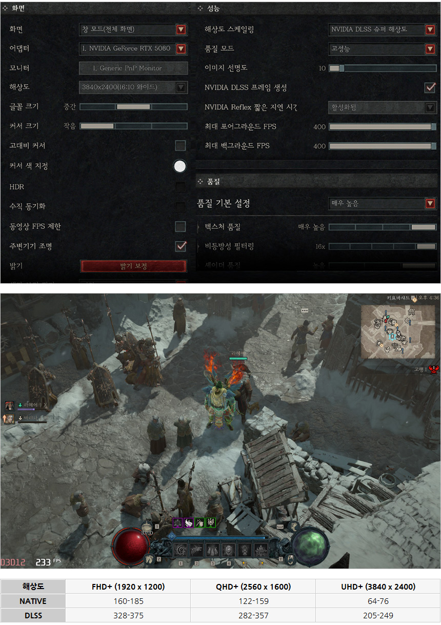 디아블로 4를 매우 높음 옵션으로 플레이 하고 있는 모습으로 DLSS를 사용하지 않아도 4K에서 부드러운 플레이가 가능했다. 단, DLSS를 활성화 하면 프레임이 대폭 상승해 훨씬 부드럽게 게임을 즐길 수 있다.