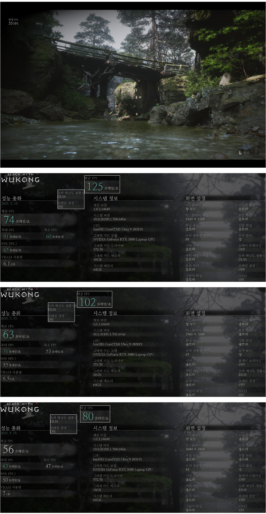 검은신화 오공 벤치마크를 실행한 모습을 DLSS를 활성화 하지 않아도 울트라 옵션에서 게임 플레이가 가능하다. 단, DLSS를 활성화 하면 프레임이 대폭 상승하기 때문에 꼭 DLSS를 활성화 하기 바란다.