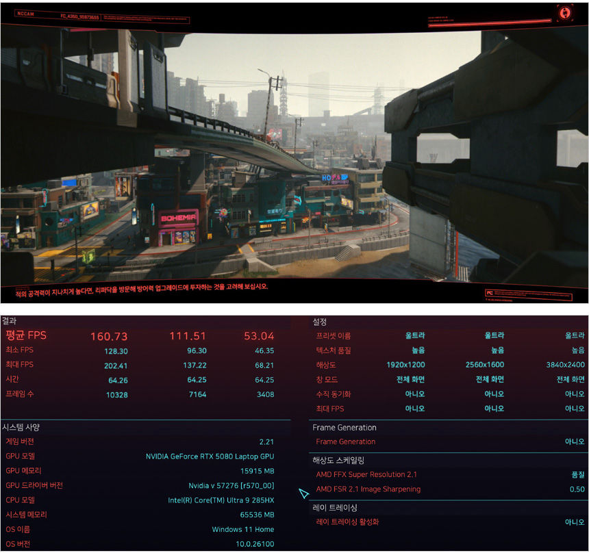사이버펑크 2077의 벤치마크를 실행한 모습으로 울트라 옵션을 적용 했음에도 4K에서 50프레임 이상을 보여주었다. (구형 보급형 게이밍 노트북은 FHD 해상도에서도 30프레임을 넘기지 못한다.) 여유롭게 게임을 플레이 할 수 있을 것이다. (더 높은 성능으로 게임을 즐기고 싶다면 커스텀 모드에서 DLSS를 활성화 하기 바란다.)