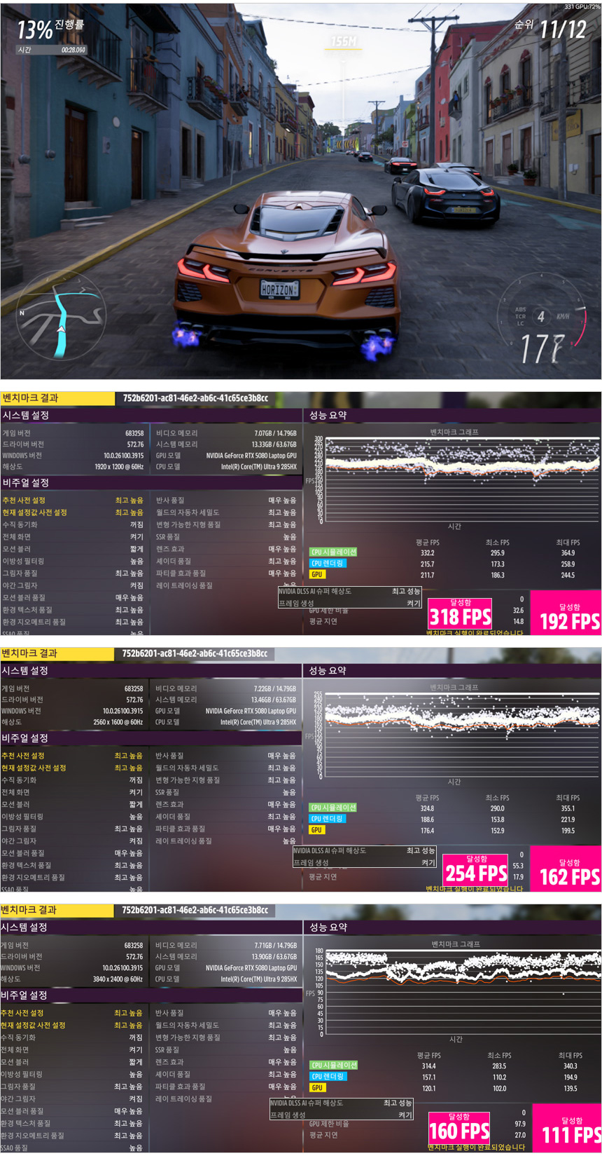 포르자 호라이즌5 벤치마크를 실행한 모습으로 어떤 해상도나 옵션 에서도 부드럽게 게임을 즐길 수 있었다. (일반 게이밍 노트북과 스코어 차가 상당히 큰 것을 확인할 수 있었다.)