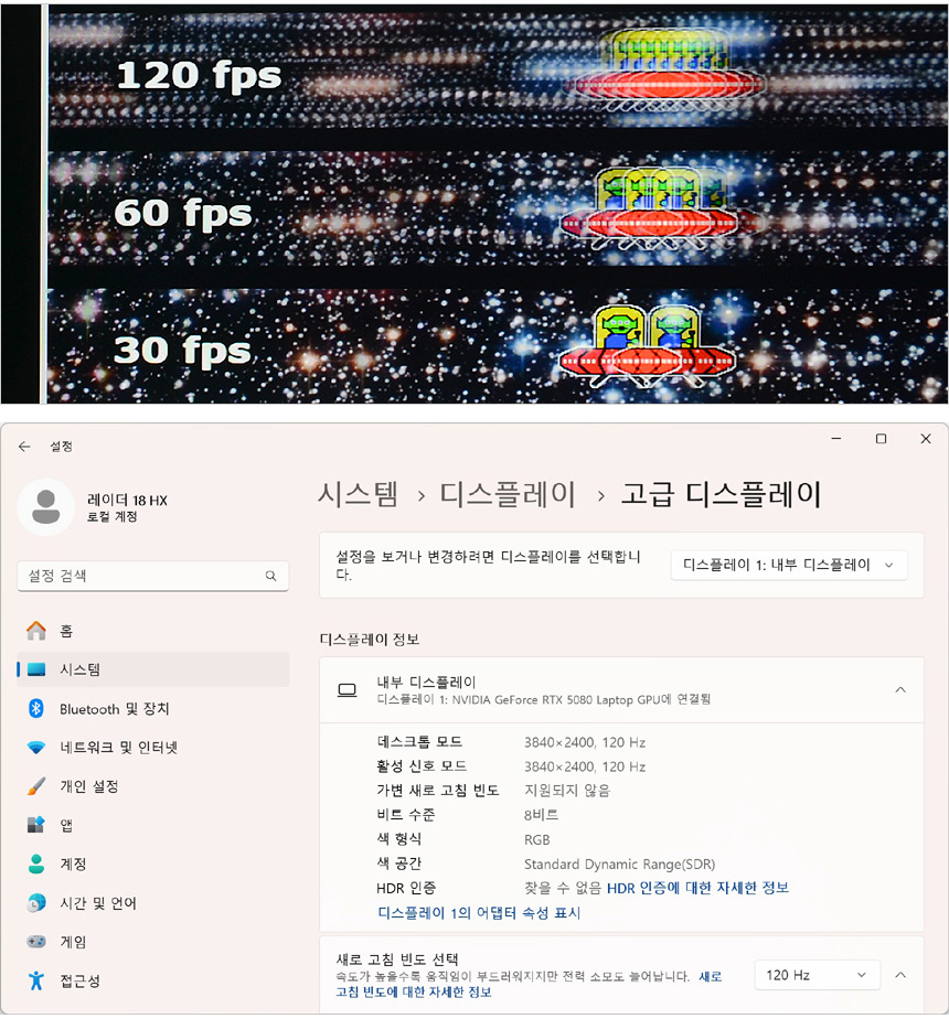 4K 고해상도 모델임에도 120Hz 주사율을 지원해 캐릭터나 적의 움직임을 분명하게 확인하고 빠르게 대응할 수 있다. 상단의 사진은 하위 프레임과 같이 재생되는 영상 (960 Pixel Per Sec) 을 셔터스피드 1/20 로 촬영한 모습으로 프레임이 낮을수록 캐릭터의 수가 적으며 프레임이 높아질수록 시간당 많은 화면이 뿌려지기 때문에 캐릭터의 수가 많은 것을 확인할 수 있다. (실제 눈으로 보면 120Hz가 훨씬 부드러워 보인다.)