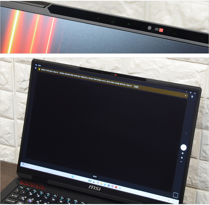 웹캠을 이용한 비주얼 해킹이나 사생활 침해를 원천적으로 차단할 수 있도록 카메라에 프라이버시 셔터가 장착된 것을 확인할 수 있다. 물리적으로 카메라를 가려주기 때문에 해킹으로 노트북 권한을 획득 하더라도 사용자나 주변 상황을 전혀 볼수 없다. (동영상을 통해 자세히 확인하기 바란다.)
