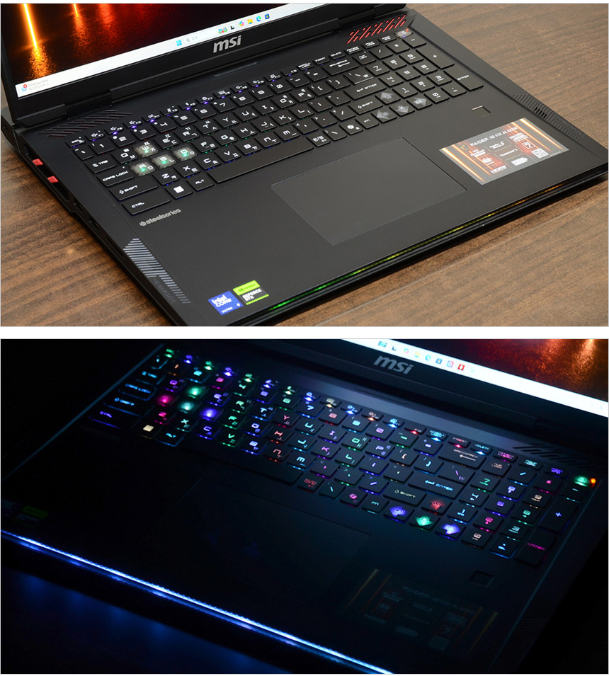 키보드의 모습으로 18형 대화면 노트북 답게 텐키를 포함한 풀사이즈 치클릿 키보드를 장착했다. Per-Key RGB 키보드가 장착되어 화려한 조명 효과를 즐길 수 있으며 스틸시리즈 S/W를 통해 컬러나 효과를 사용자에 맞게 설정할 수 있다.