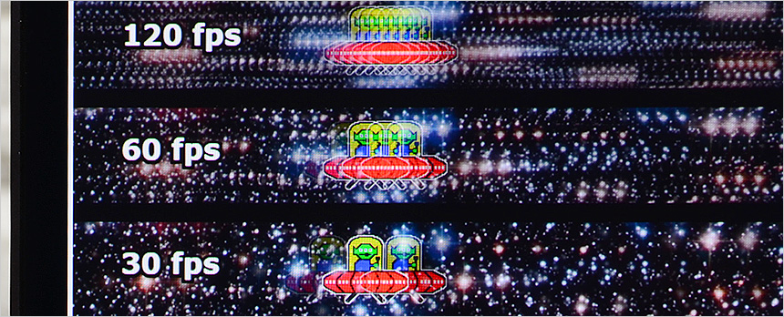60Hz 지원 일반 4K모니터와 달리 120Hz 의 높은 주사율을 지원해 게이밍 모니터로도 손색이 없다. 특히 0.03ms 에 불과한 빠른 응답속도 지원으로 빠르게 움직이는 영상을 잔상없이 부드럽고 선명하게 표현한다. 상단의 사진은 주사율에 따른 캐릭터 움직임을 카메라로 촬영한 모습으로 (셔터속도 1/20) 하위 프레임과 확연한 차이를 보여주었다.