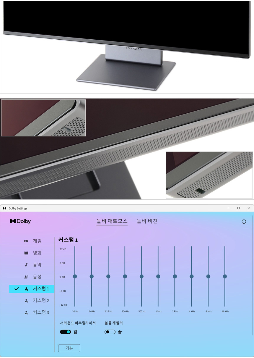 모니터 하단부의 모습으로 상태표시 LED와 도난 방지를 위한 시큐리티 홀이 설치된 것을 확인할 수 있다. 또한 4개의 7W 우퍼와 2개의 3W 트위터를 장착해 PC나 노트북에서는 경험할 수 없는 퀄리티 높은 사운드를 즐길 수 있으며 돌비 애트모스와 Waves 맥스오디오를 지원해 풍부하고 디테일하며 사실적인 사운드를 들려준다. (사운드에 특화된 올인원PC 보다 퀄리티가 뛰어나 상당히 놀랐다.)