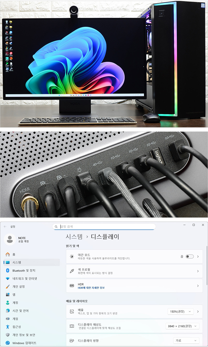 테스트를 위해 PC와 모니터를 책상위에 설치한 모습으로 30형 이상의 대화면 제품들과 달리 많은 공간을 차지하지 않았다. 27형 패널에 슬림베젤 지원으로 협소한 책상공간에도 편하게 설치해 사용할 수 있는 모델이다. 디자인 부분에서 말씀드린 것과 같이 DP 뿐만 아니라 HDMI와 C타입 입력이 가능해 다양한 디바이스와 연결할 수 있으며 주변기기도 손쉽게 연결해 사용할 수 있다.