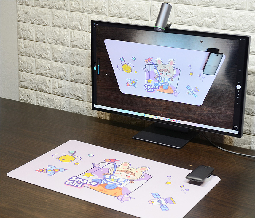 카메라 각도를 자유롭게 조절할 수 있는점도 큰 특징중 하나라 할 수 있다. 책상위에서 그림을 그리거나 피아노를 치는 등의 작업을 할 경우 일반 카메라로는 촬영이 상당히 힘든데 반해 기본 장착된 4K 모듈형 카메라의 각도를 원하는 대로 조정할 수 있어 편하게 촬영을 할 수 있다. 특히 노트북이나 올인원PC에 장착된 카메라와는 비교가 되지 않을 만큼 뛰어난 카메라 화질을 제공해 (디테일과 화질을 보고 깜짝 놀랄 정도였다.) 고가의 카메라를 구입하지 않아도 퀄리티 높은 영상을 만들 수 있다.
