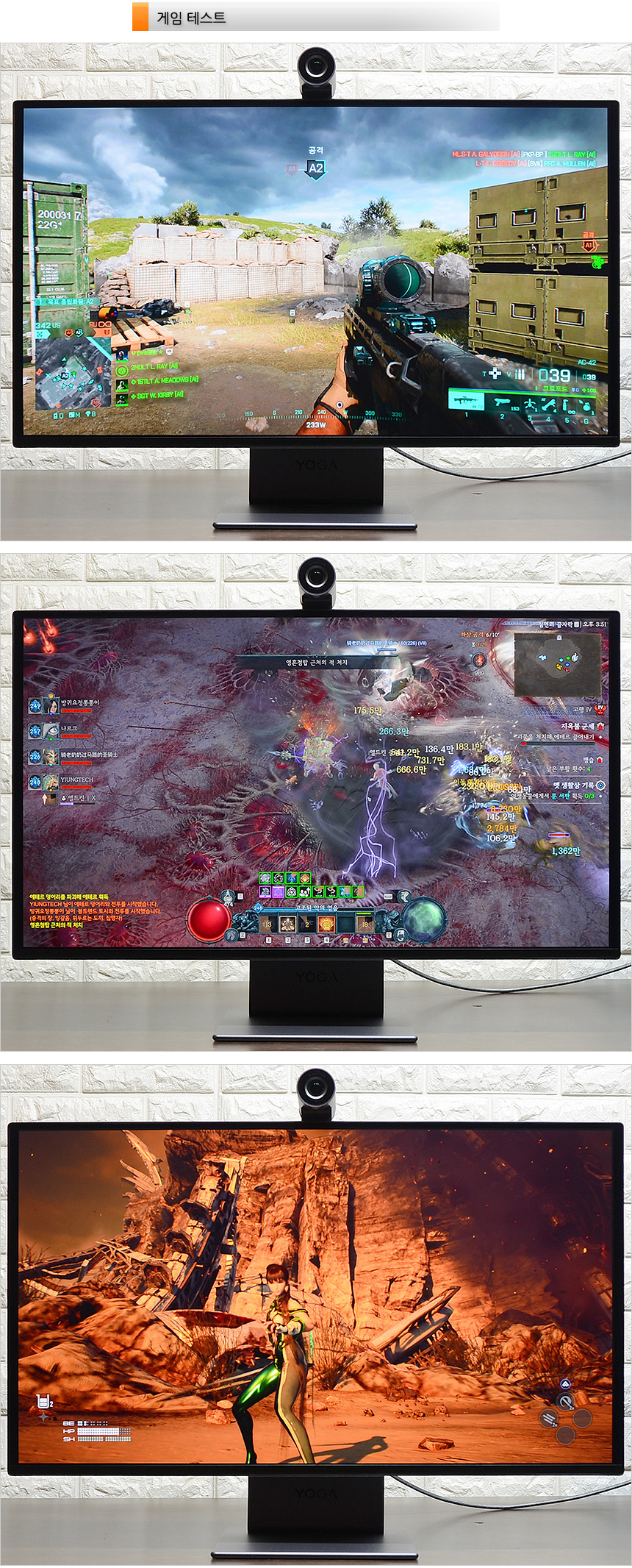 상단의 사진은 베틀필드 2042, 디아블로 4, 스텔라 블레이드를 플레이 하고 있는 모습으로 120Hz 주사율을 지원해 물 흐르듯 부드러운 영상을 보여주었으며 0.03ms에 불과한 짧은 응답속도를 지원해 잔상으로 인한 스트레스를 전혀 느끼지 않았다. 또한 지싱크를 활성화 해 어떤 상황에서도 화면이 찢어지는 등의 문제는 없었다. (빠른 화면전환으로 인한 어지럼증 없이 게임을 즐길 수 있었다.)