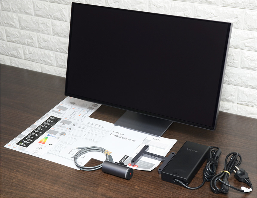 풀KIT 의 모습으로 다양한 액세서리가 제공되는 것을 확인할 수 있다. 모니터를 비롯해 400W 전원 어댑터와 전원 케이블, 베사마운트가 포함되어 있으며 썬더볼트 4 나 USB 4 단자를 지원하는 노트북 등과 편하게 연결할 수 있도록 C타입 케이블을 제공한다. 또한 탈부착이 가능한 4K 카메라와 캘리브레이션 차트, 퀵 매뉴얼, 보증서 등이 포함된 것을 확인할 수 있다.